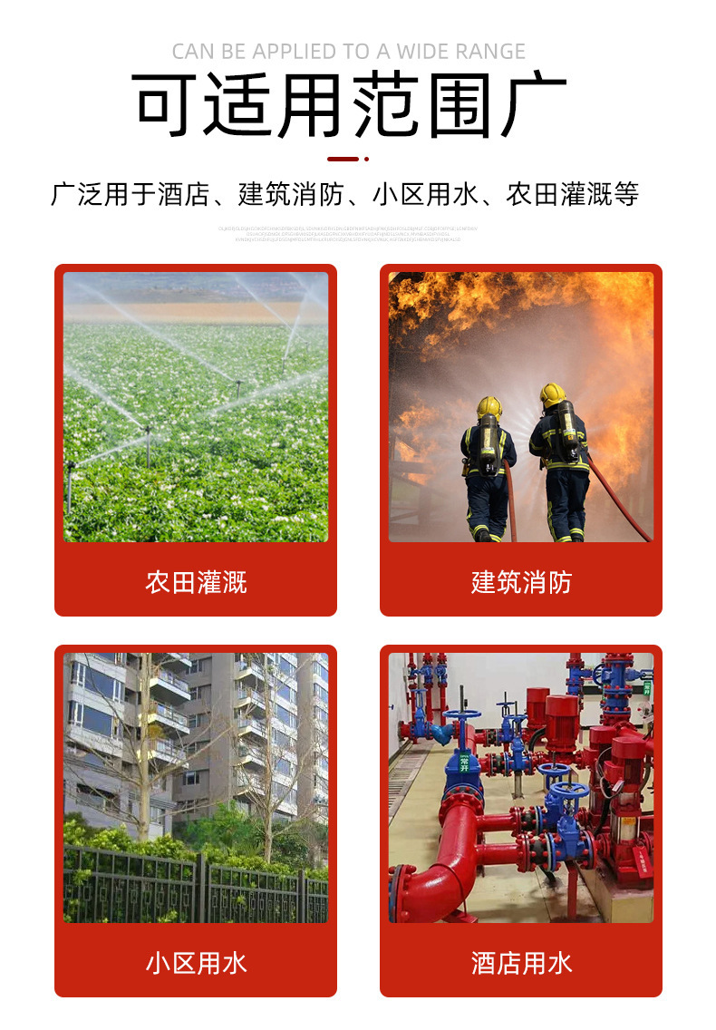 提供穩(wěn)定高壓水源: 市政自來水的水壓通常只夠居民生活使用,遠(yuǎn)遠(yuǎn)達(dá)不到撲滅高樓火災(zāi)所需的水壓和水量。消防泵的作用就是將水加壓,并持續(xù)穩(wěn)定地輸送到滅火終端。